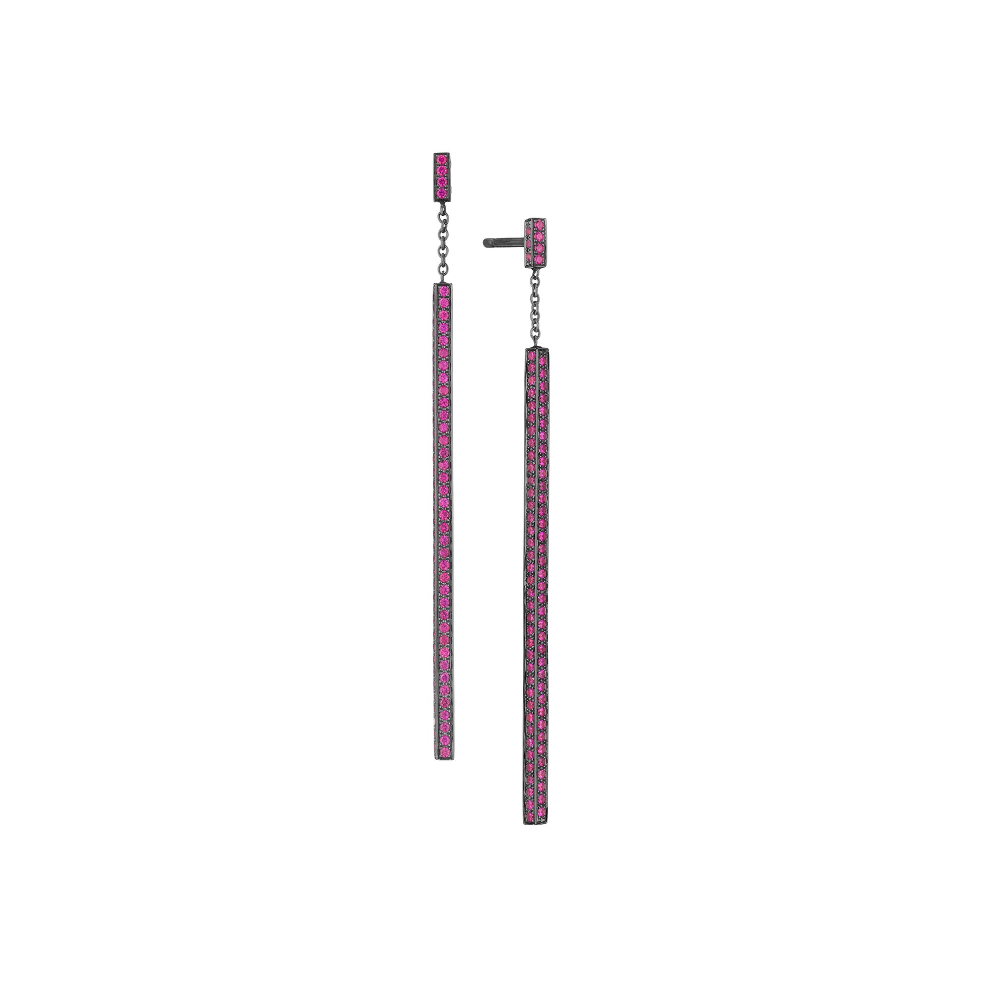 A pair of Stick earrings from the Piece collection, featuring ruby on three sides handcrafted in 18-karat black gold.