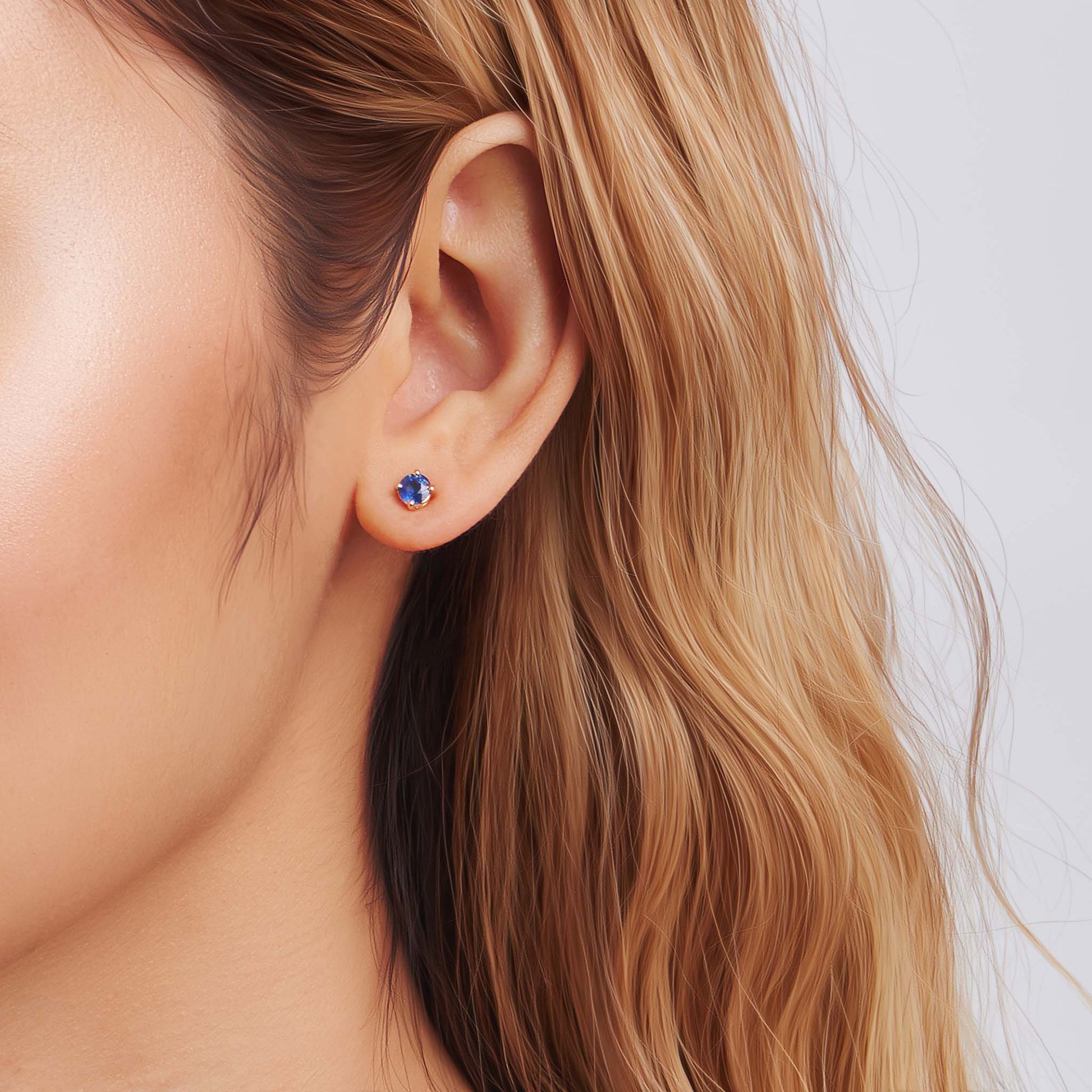 A pair of round brilliant-cut blue sapphire stud earrings set in 18-karat gold.